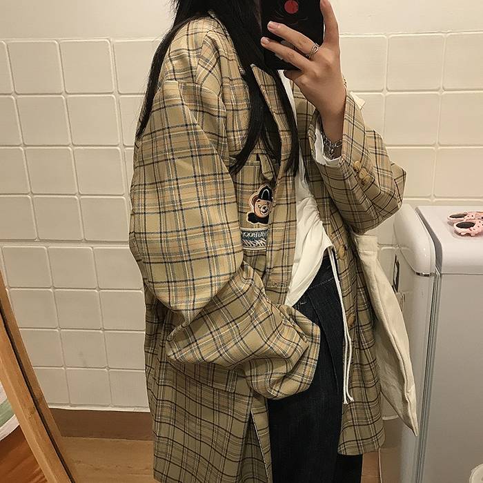 西装外套女秋季 酸菜鱼家新款宽松复古休闲廓形格纹西服