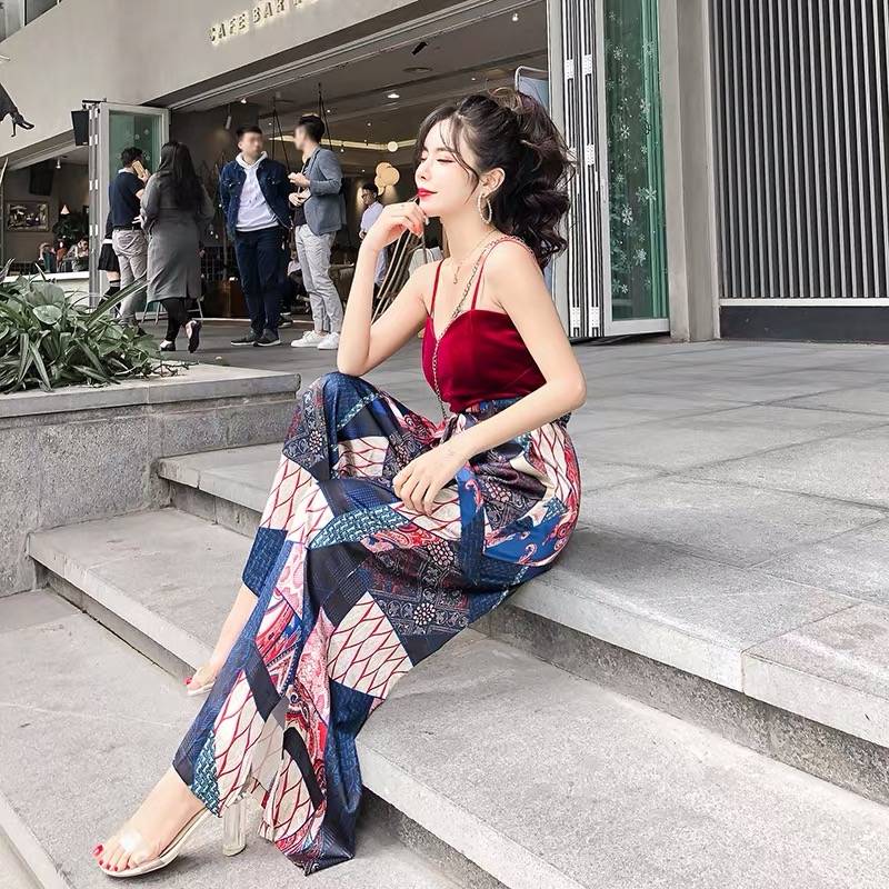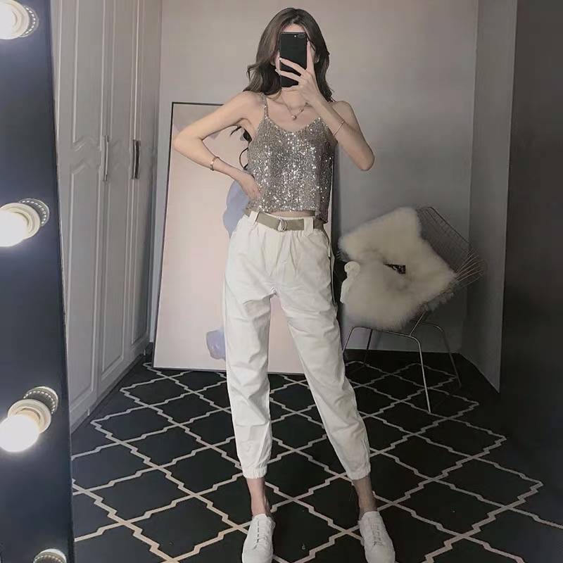 网红套装两件套2019新款宽松老爹裤+亮片百搭吊带背心上衣潮2392