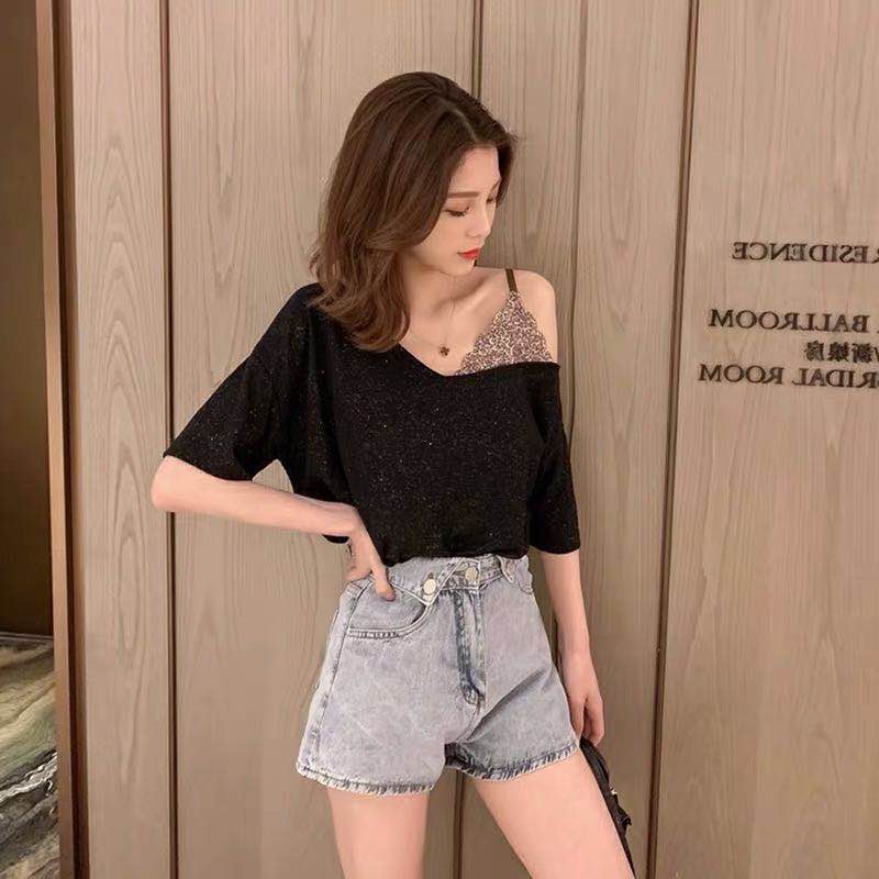 夏季女露肩性感吊带豹纹学生T恤拼接假两件V领上衣亮闪闪打底小衫