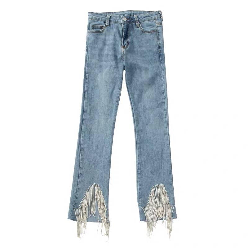 高腰牛仔裤女夏季修身韩版紧身九分小脚cec裤子直筒显瘦百搭流苏