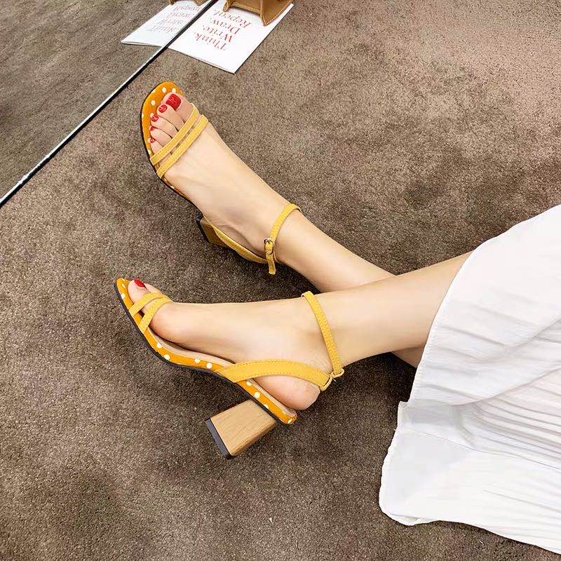 网红凉鞋女2020新款夏季百搭仙女风一字带小清新波点中粗跟高跟鞋