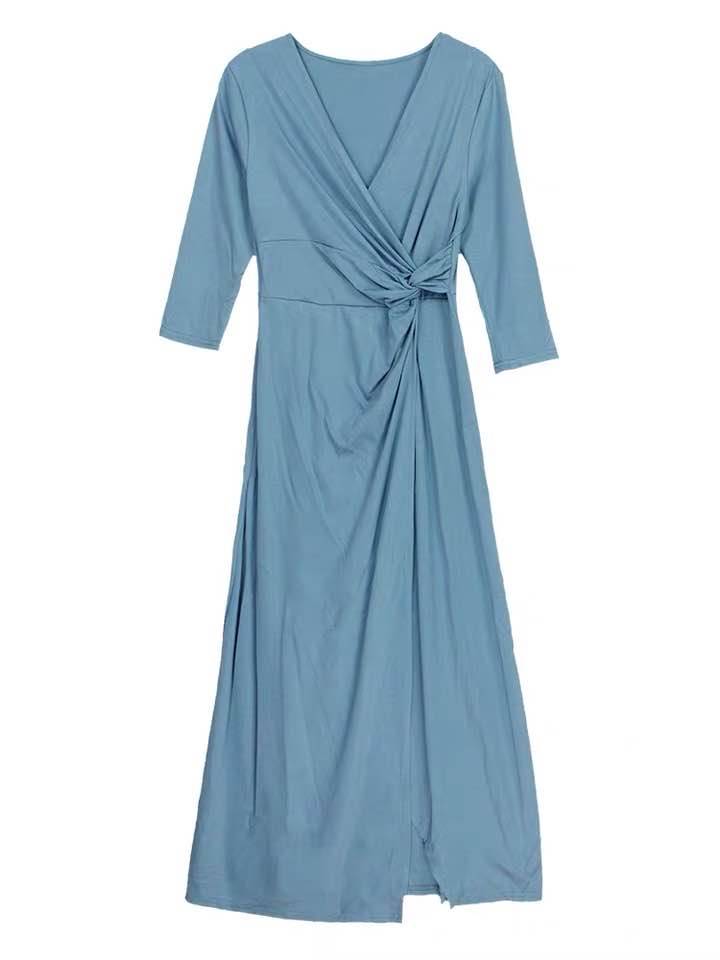 连衣裙女春装2020年新款气质v领扭结收腰显瘦中长款开叉针织裙子