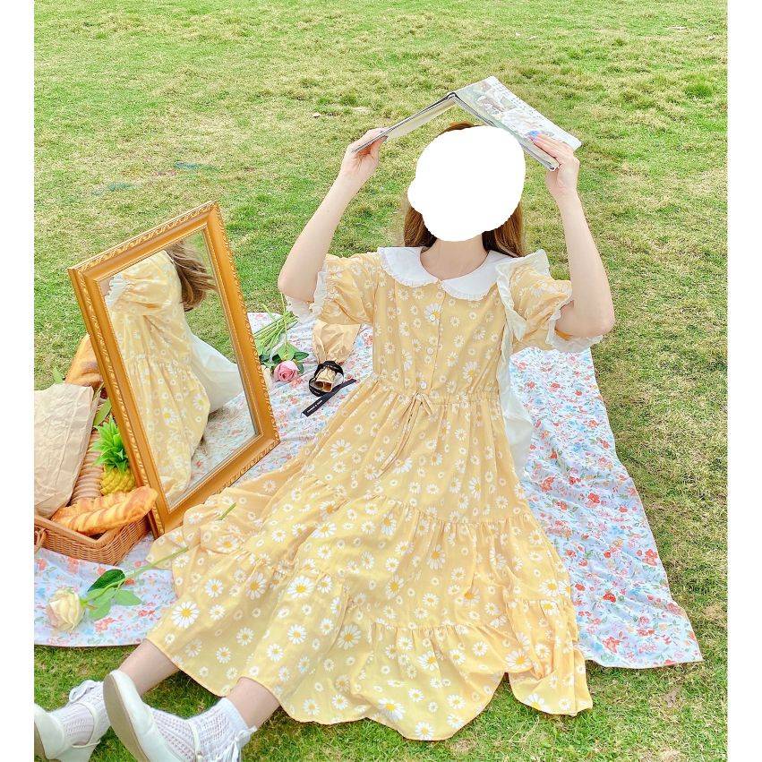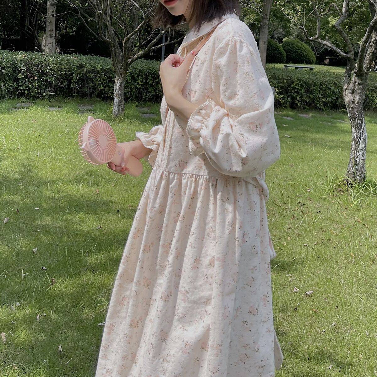 2020春复古v领长袖中长款小雏菊碎花雪纺连衣裙秋季裙子女