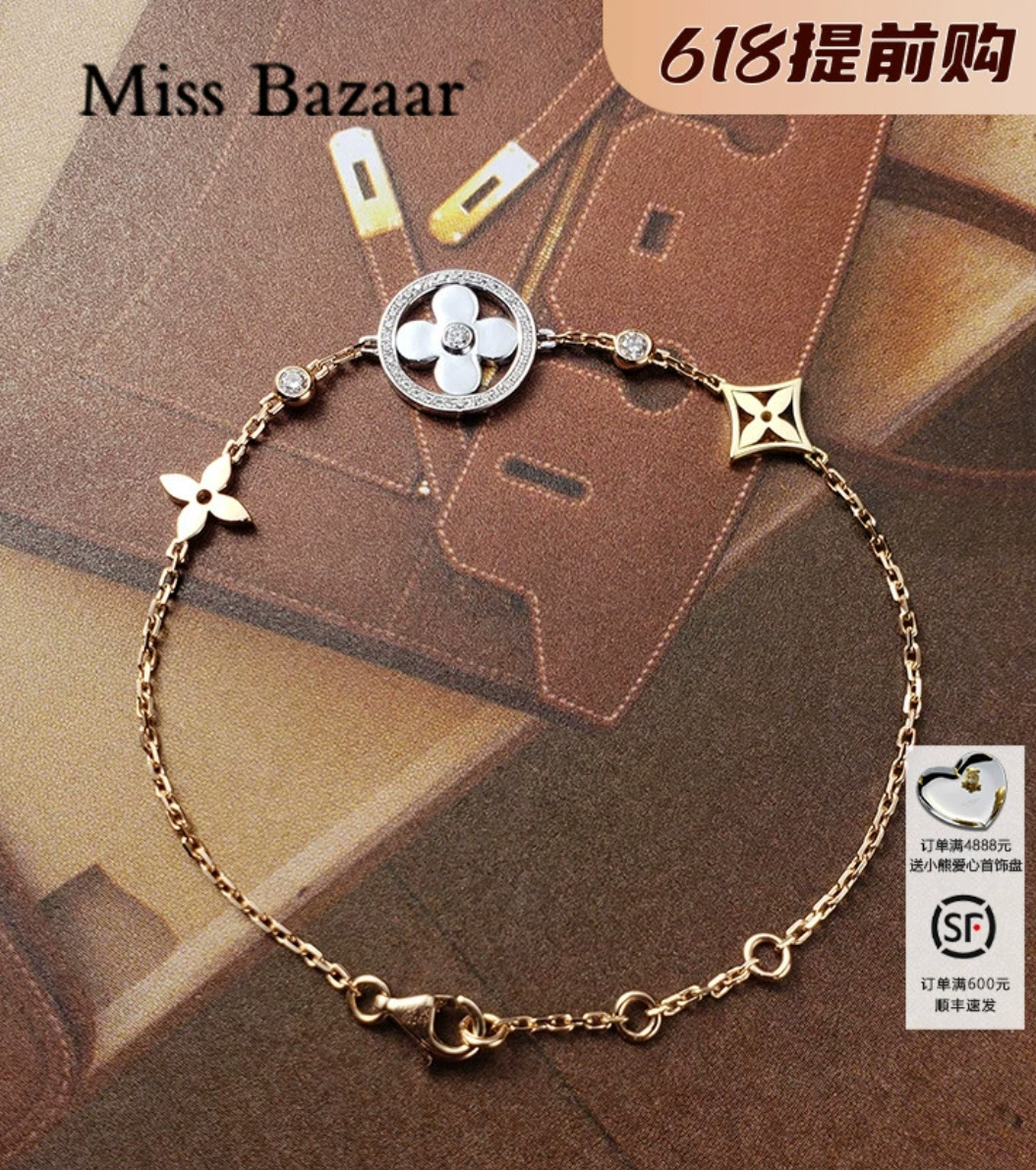 大牌BLOSSOM系列 18K金钻石手链 黄金四叶草可调节三色金时尚手镯
