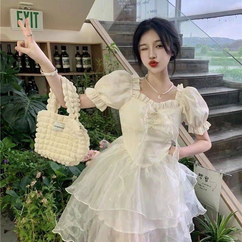乐町气质复古连衣裙2021新款春女装奶油蜜桃蝴蝶结连衣裙