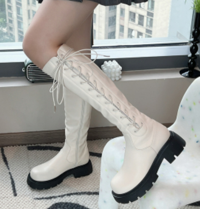 小黄鸡系带长筒靴厚底显瘦秋冬新款骑士靴马丁靴圆头