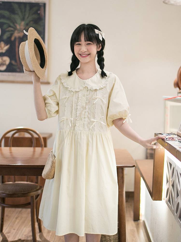 自制 奶呼呼奶甜裙子蝴蝶结泡泡袖法式连衣裙夏季小个子