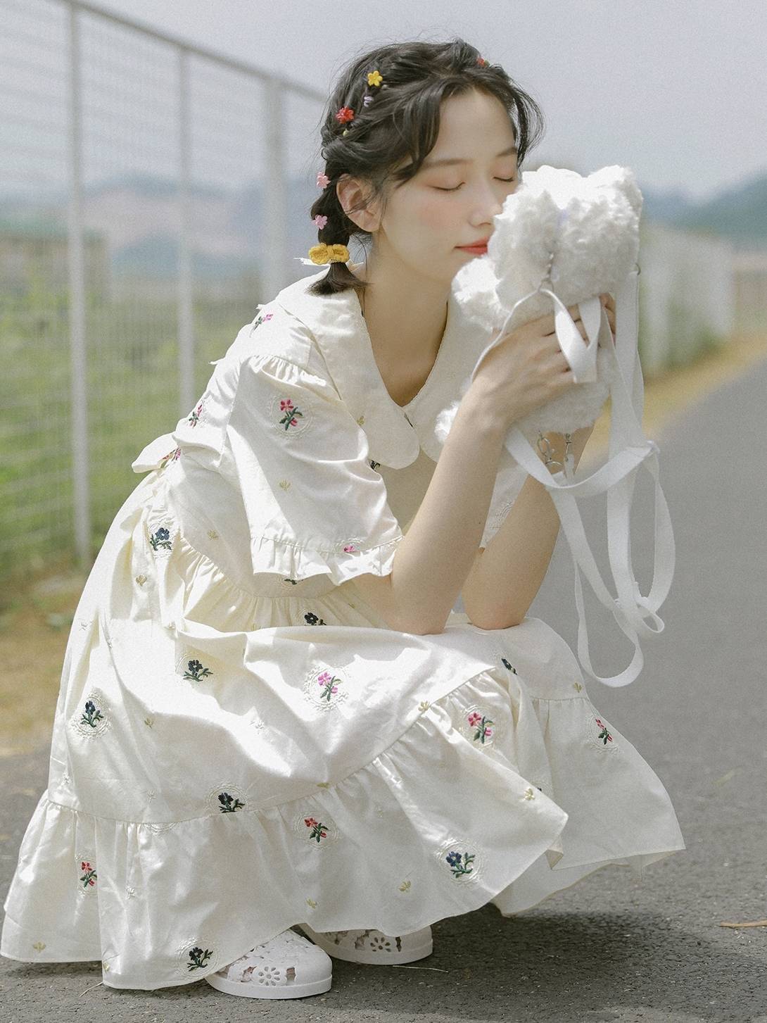 重工花朵刺绣连衣裙浅杏色娃娃领荷叶边中款复古森系甜美