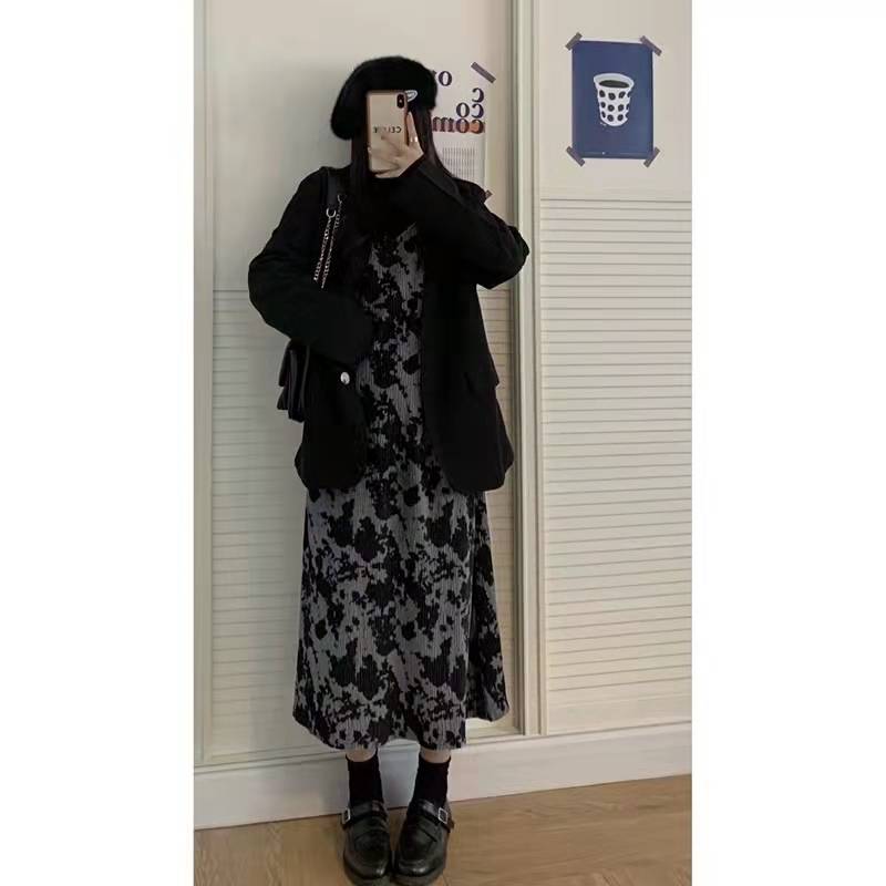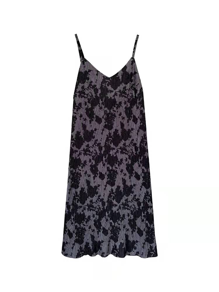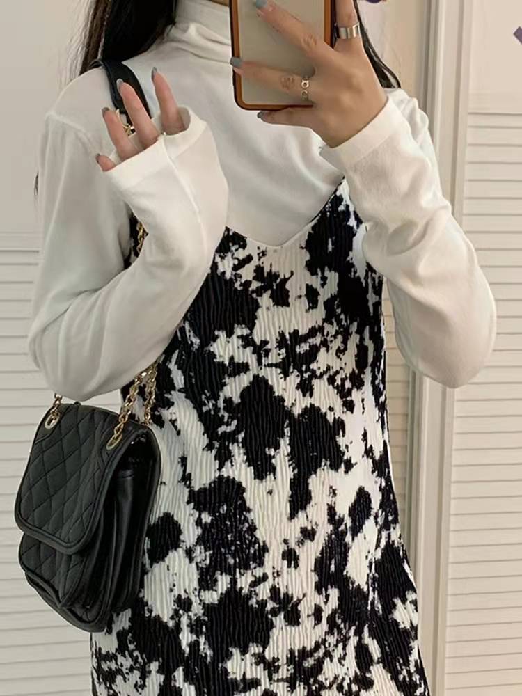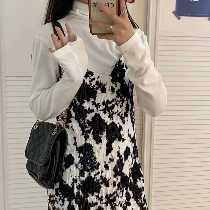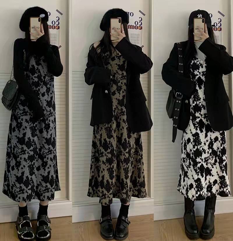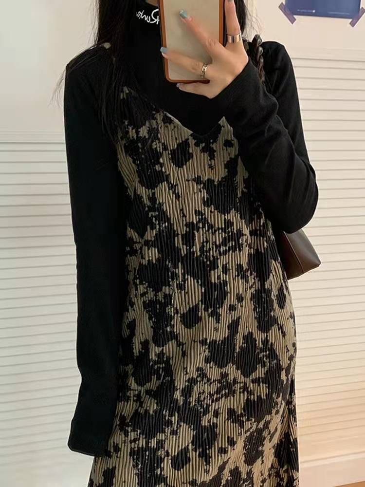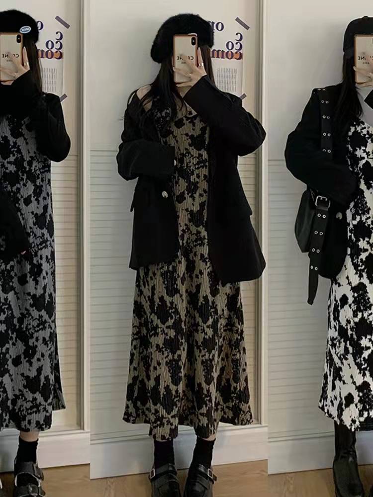 裙子女秋冬季2021年新款复古气质扎染吊带连衣裙内搭气质显瘦长裙
