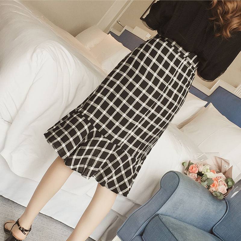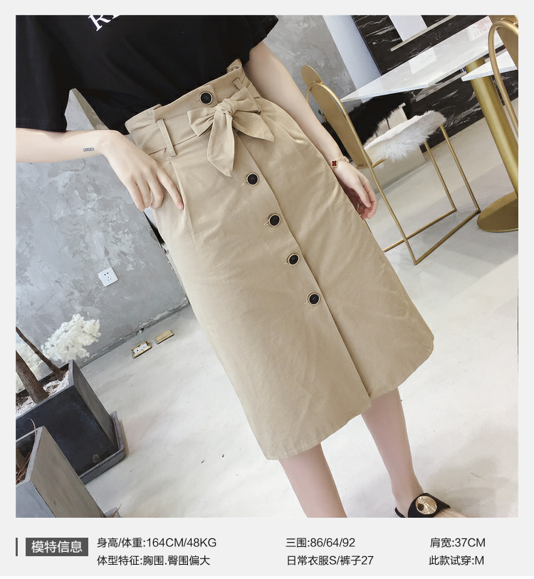 裙子女夏装新款高腰蝴蝶结单排扣纯色半身裙chic中长款显瘦包臀裙