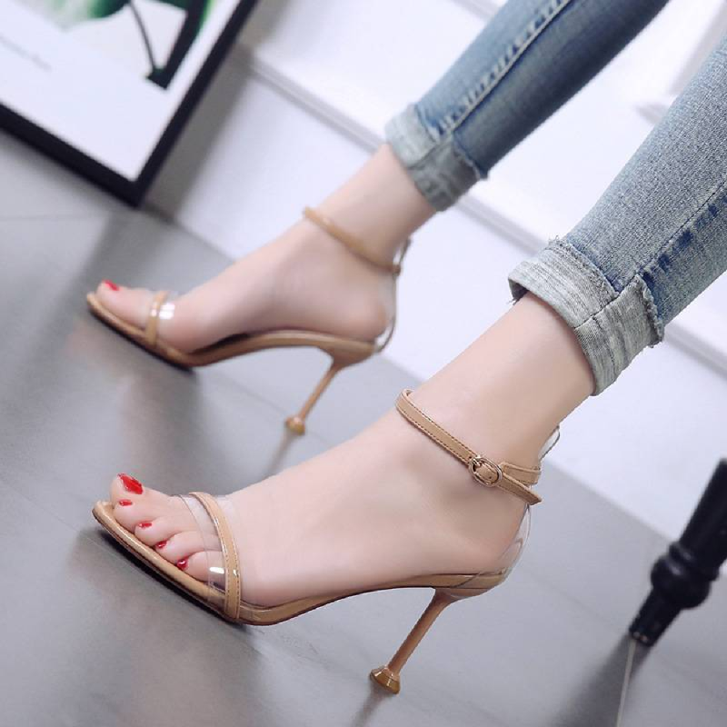2019夏季新款细跟猫跟凉鞋透明一字带露趾女鞋防水台百搭时尚高跟鞋