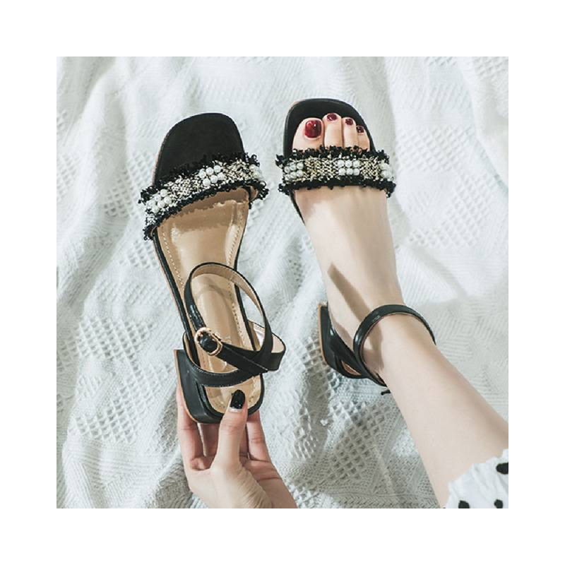 高跟凉鞋女夏季2020新款欧美时尚珍珠碎花带时装单鞋粗跟浅口女鞋