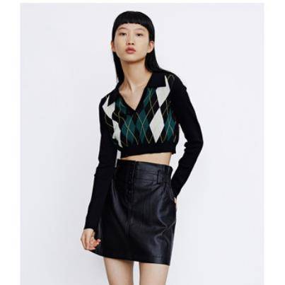 秋冬新品青春女装菱格纹休闲棉质V领针织T恤