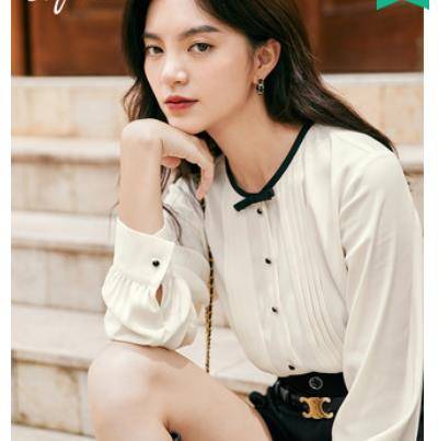 伊芙丽百搭衬衫女2021新款圆领秋装雪纺韩版撞色蝴蝶结复古小上衣