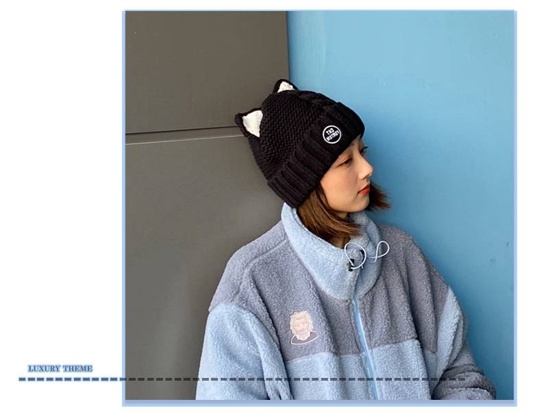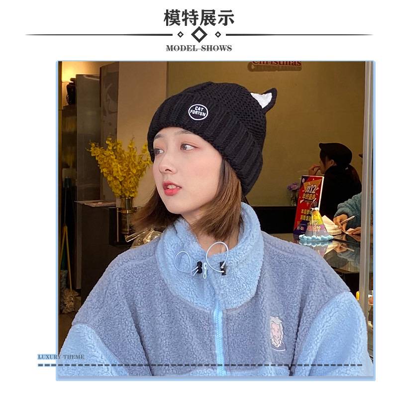 显脸小猫耳朵针织毛线帽子女秋冬韩版加绒保暖日系百搭可爱冷帽潮