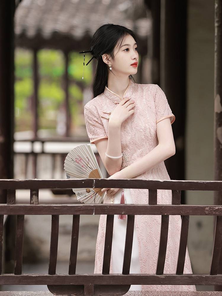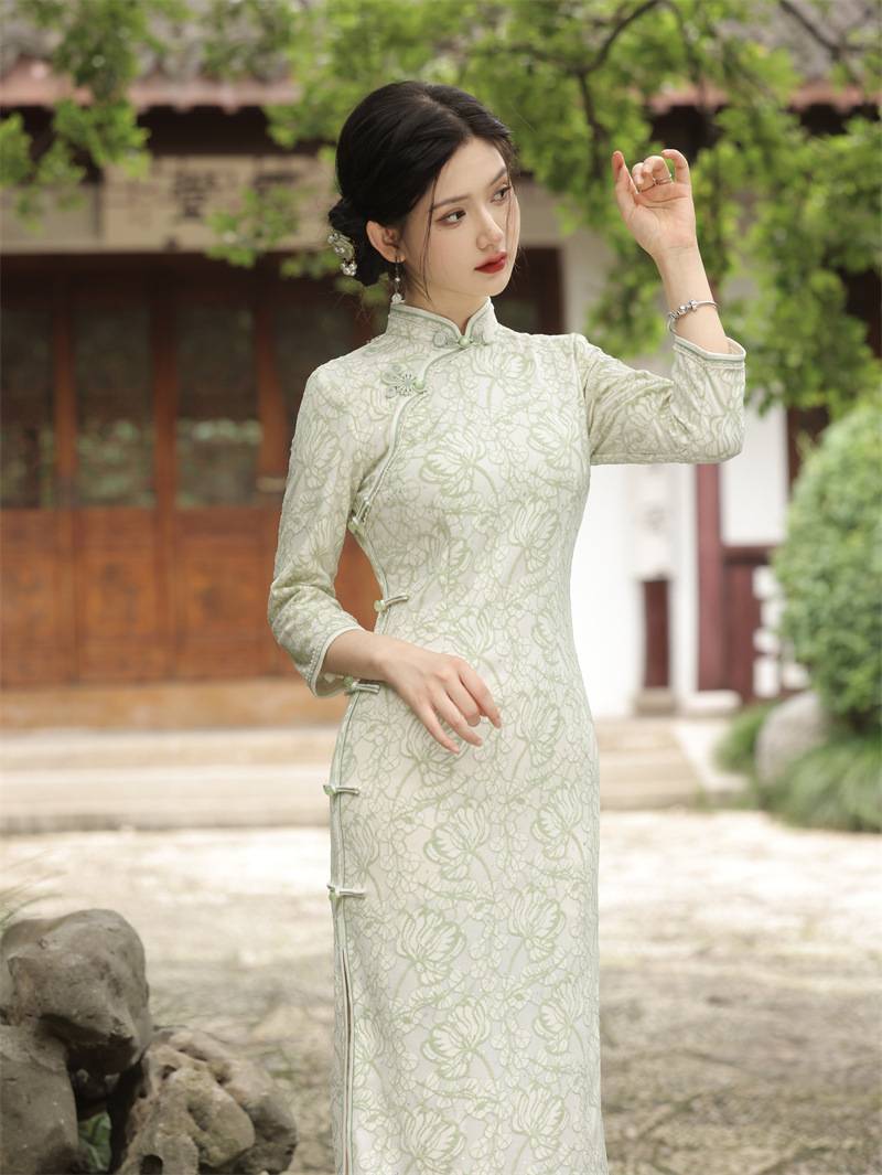 2023秋季新款 复合蕾丝花扣蕾丝花边侧八扣中长款旗袍