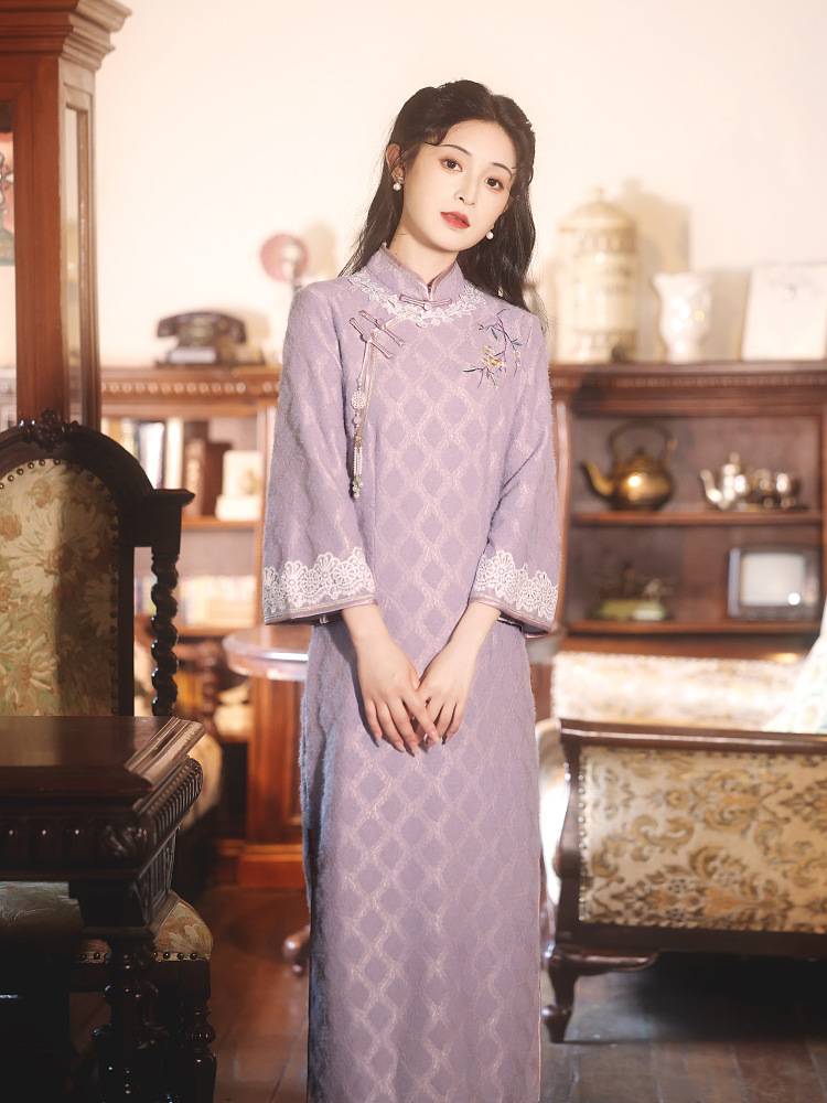 紫色旗袍2023新款改良年轻款高端气质秋冬季长袖复古民国风老上海