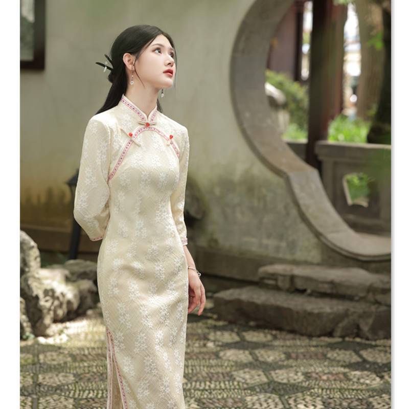 时尚年轻少女款改良新中式长款七分袖旗袍2023秋新款复古蕾丝旗袍
