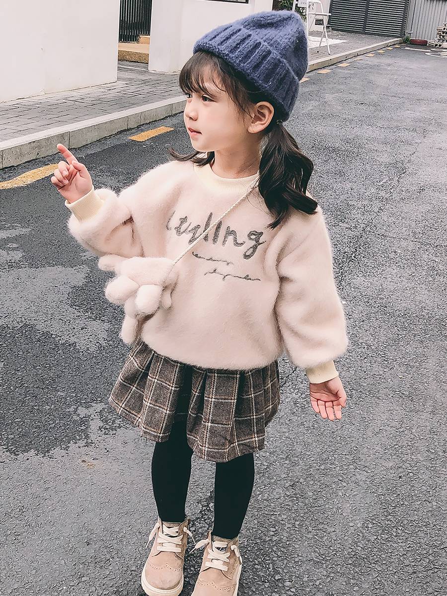 童装女童冬装2018新款韩版针织字母印花加绒卫衣格子短裙两件套装