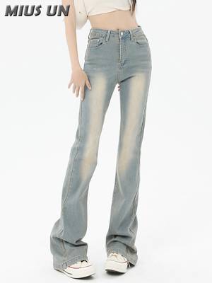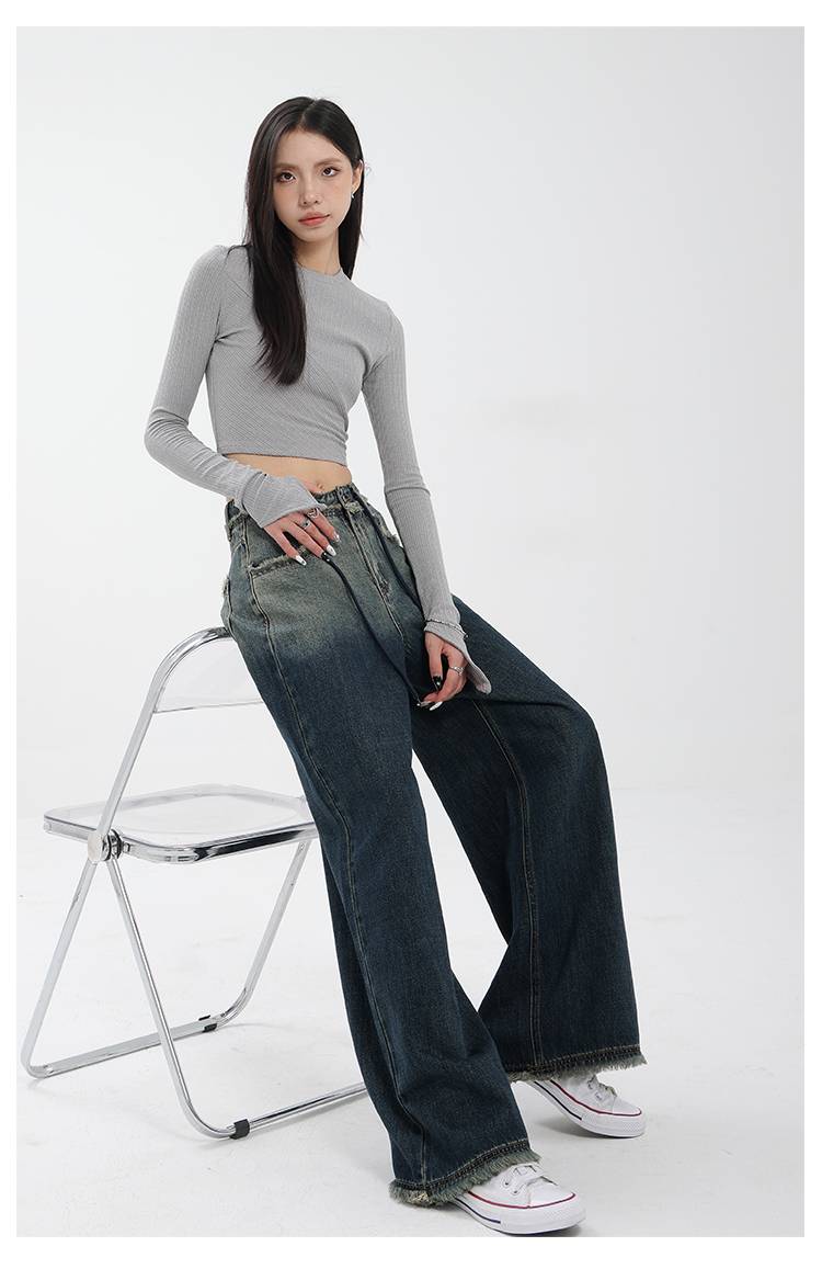 2023年新款咖色洗水阔腿拖地牛仔裤女渐变毛边设计感直筒裤