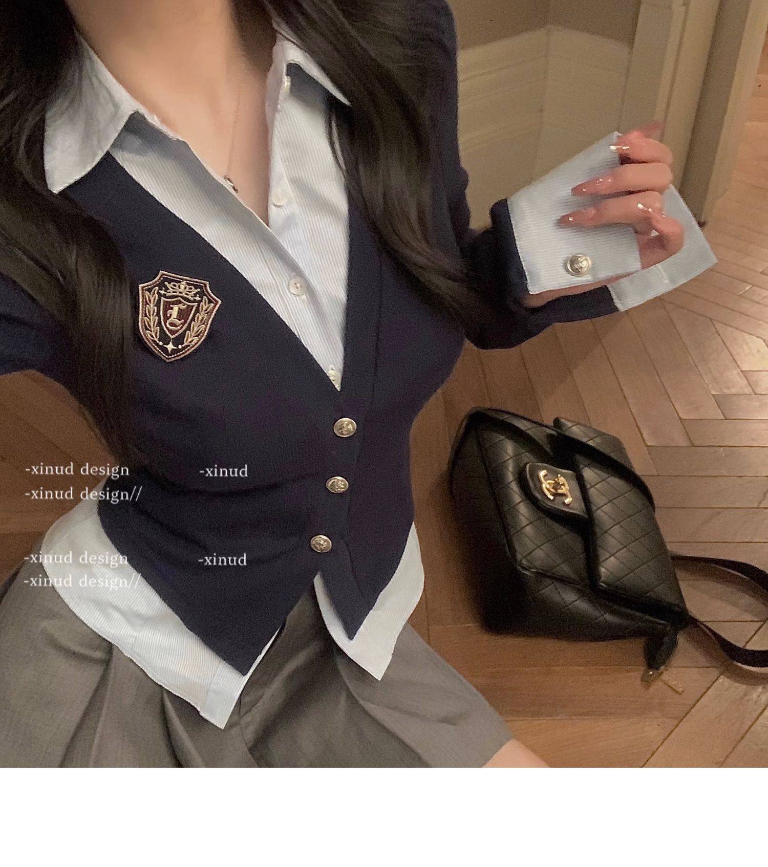 XINUD韩高oni*原创假两件蓝色条纹衬衫学院风上衣收腰V领高级套装