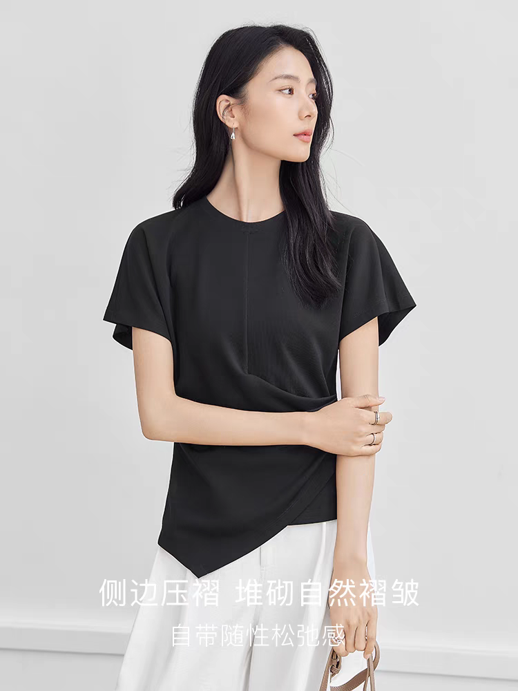 对白时髦不规则空气层T恤女2025夏季新款蝙蝠袖收腰显瘦短袖上衣