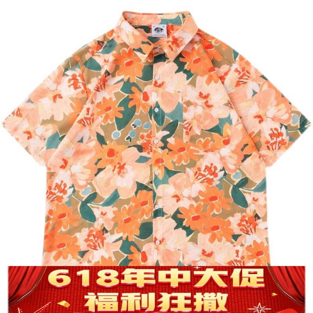 改楠港风复古碎花满印短袖衬衫男潮牌街头bf慵懒风情侣花