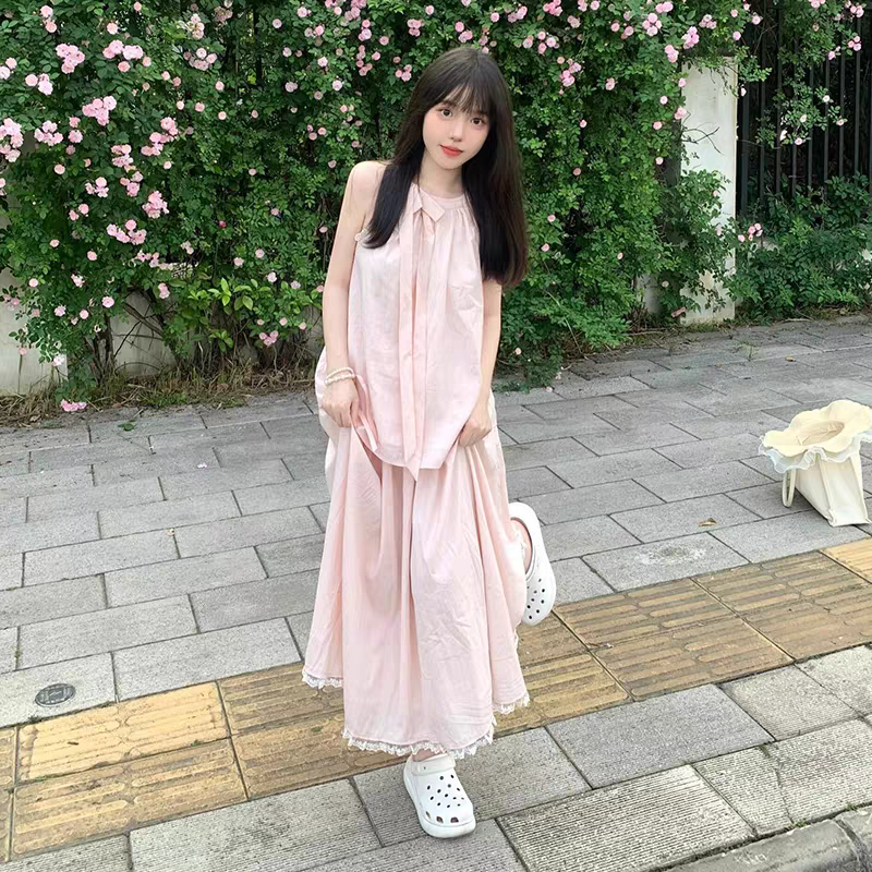 法式甜美风两件套蝴蝶结挂脖背心女夏季粉色高腰拼接半身裙套装