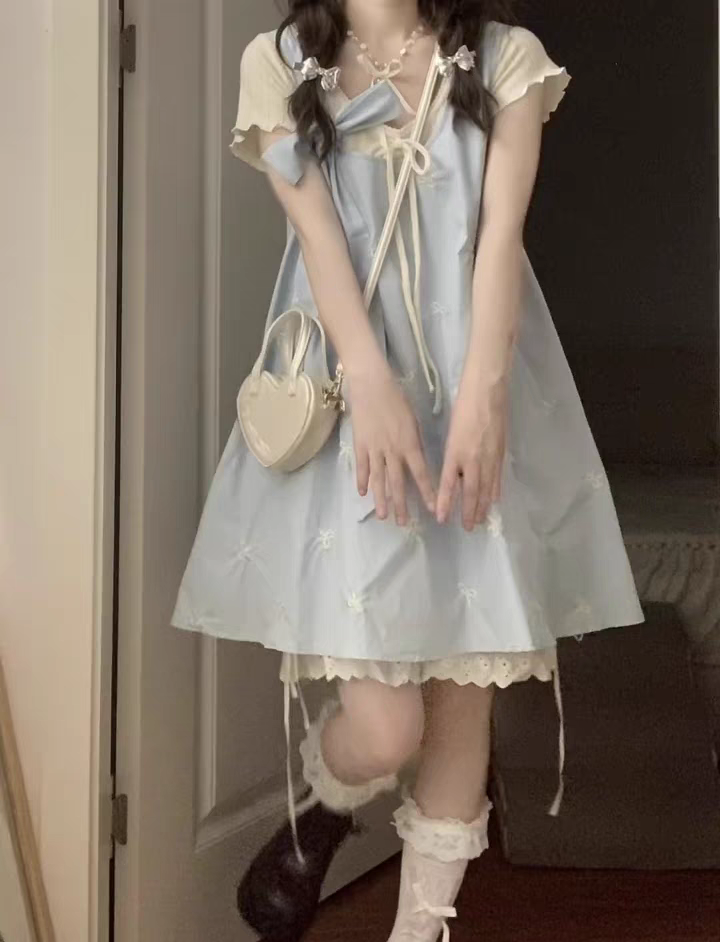 甜美可爱蝴蝶结刺绣背带娃娃连衣裙女学生 杏色针织上衣两件套装