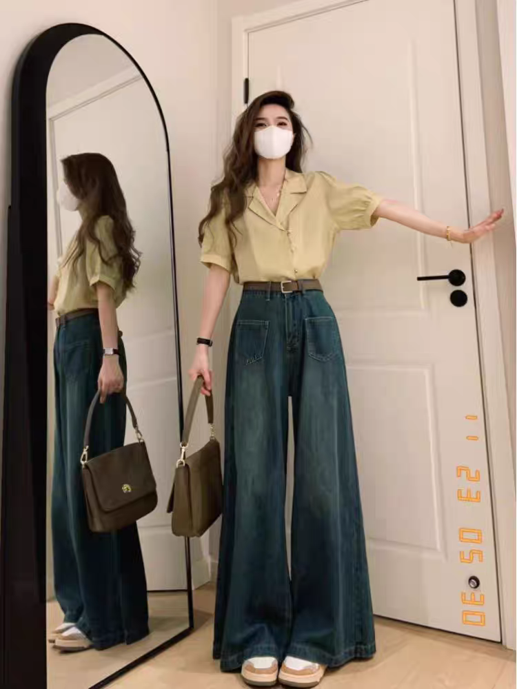 阔腿牛仔裤女夏季2024新款设计感小众高腰直筒裤子小个子拖地长裤