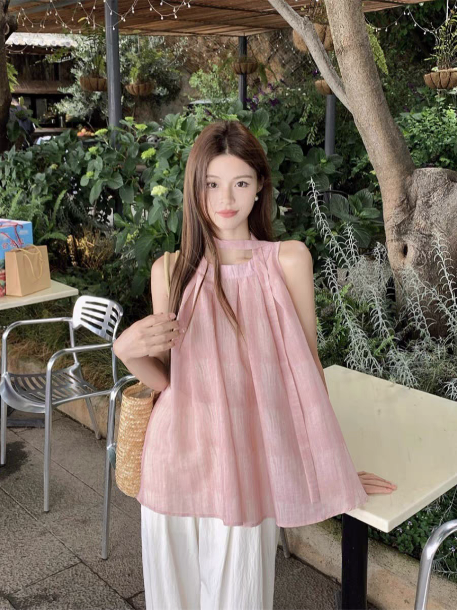 度假风褶皱晕染绑带无袖衬衫女夏季薄款甜美法式宽松A字背心上衣