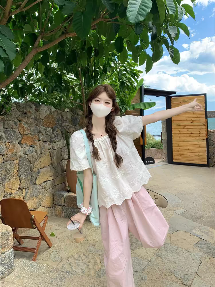 法式甜美风减龄套装女夏季2024新款蕾丝花边短袖衬衫九分裤两件套