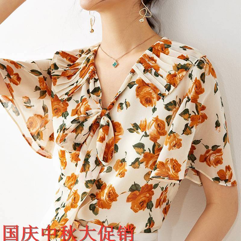 2020夏季新款十三行女装批发海军领碎花印花雪纺衬衫短袖女式上衣