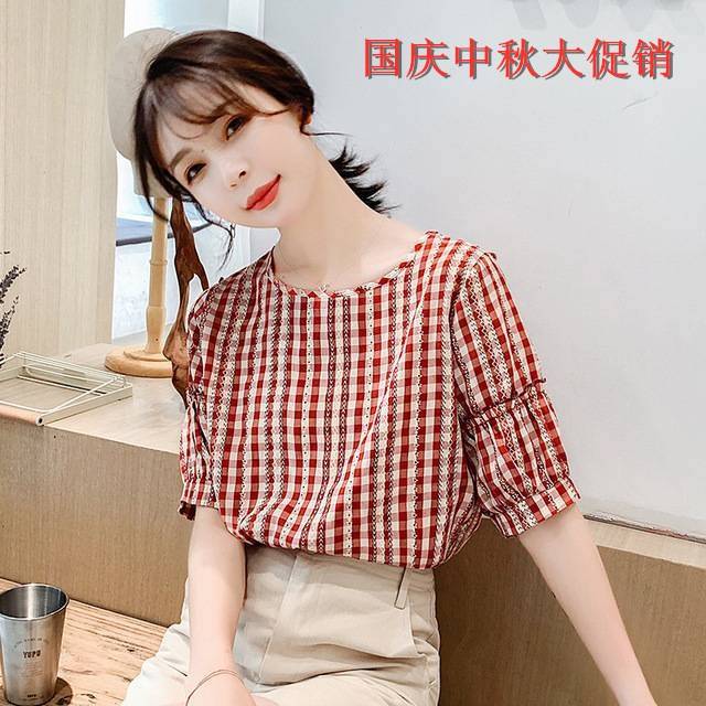 2020夏季新款韩版小清新短袖雪纺衫小格子上衣百搭圆领打底衫
