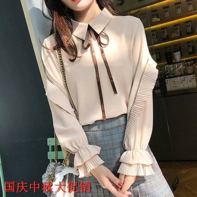 2020春季新款韩版长袖衬衫女打底衫宽松喇叭袖系带衬衣