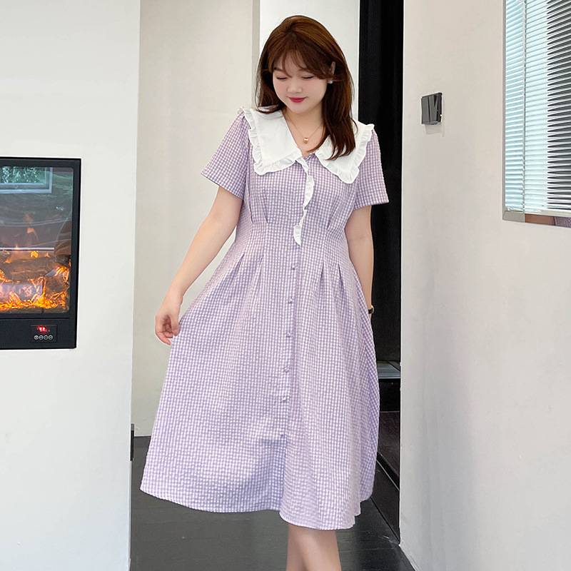 2022夏季新款大码女装200斤胖mm减龄娃娃领格子连衣裙
