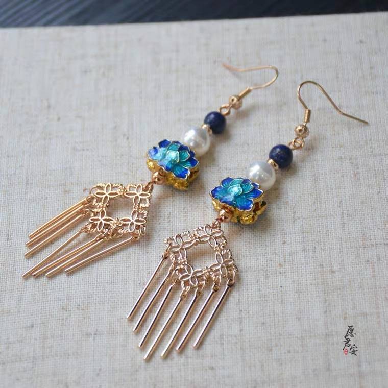 手工烧蓝莲花长流苏耳环无耳洞耳坠古典耳饰旗袍配饰汉服饰品