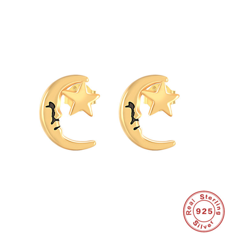 跨境热销S925纯银个性复古星星月亮耳钉创意简约防过敏小巧女耳环
