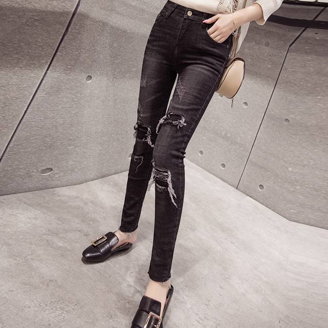 破洞显瘦牛仔裤女2018夏季新款韩版大码女装贴布弹力女装小脚裤女