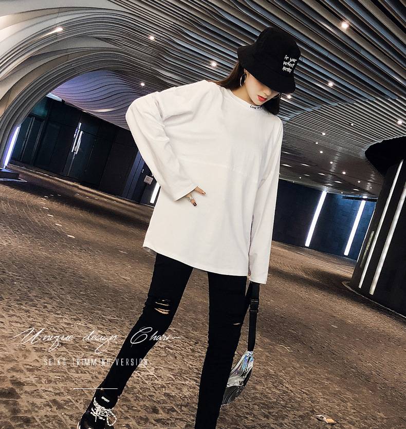 实拍2018春秋装新款嘻哈女装宽松中长款长袖T恤白色上衣女