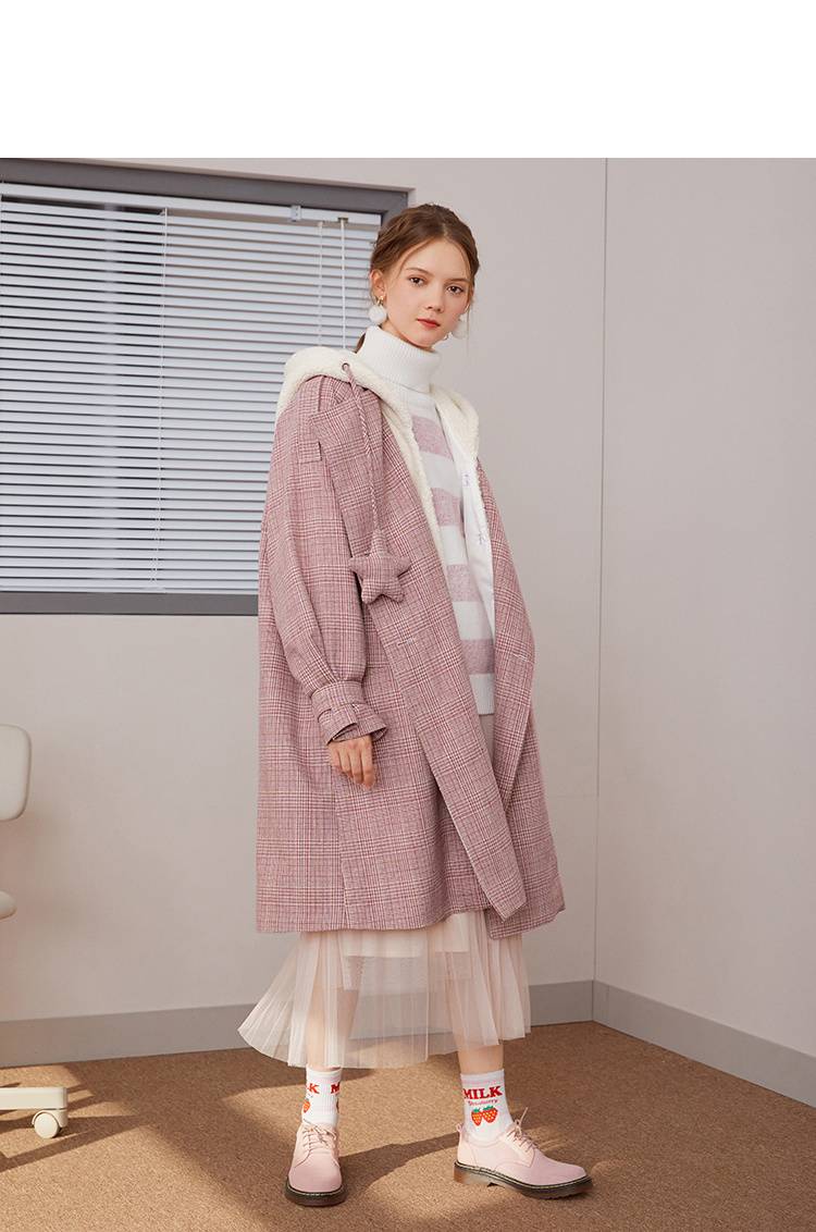 2018秋冬款韩版女连帽毛茸茸两件套格纹中长款大衣外套