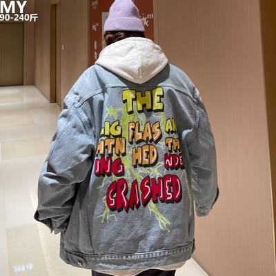 美式字母涂鸦牛仔夹克男秋季装加肥加大码潮胖人宽松休闲痞帅外套