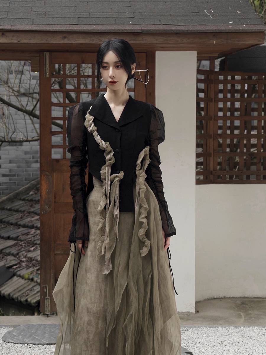 ONMOON 秋季薄款纱袖飘逸长袖衬衫女 2022原创仙女风法式暗黑上衣