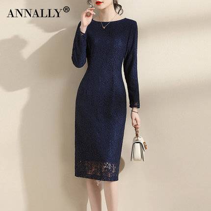 Annally秋季新款优雅气质修身显瘦藏蓝色蕾丝连衣裙女中长款