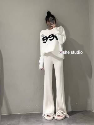 韩范chic时尚套装女2022秋冬新款百搭宽松字母毛衣显瘦流苏阔腿裤