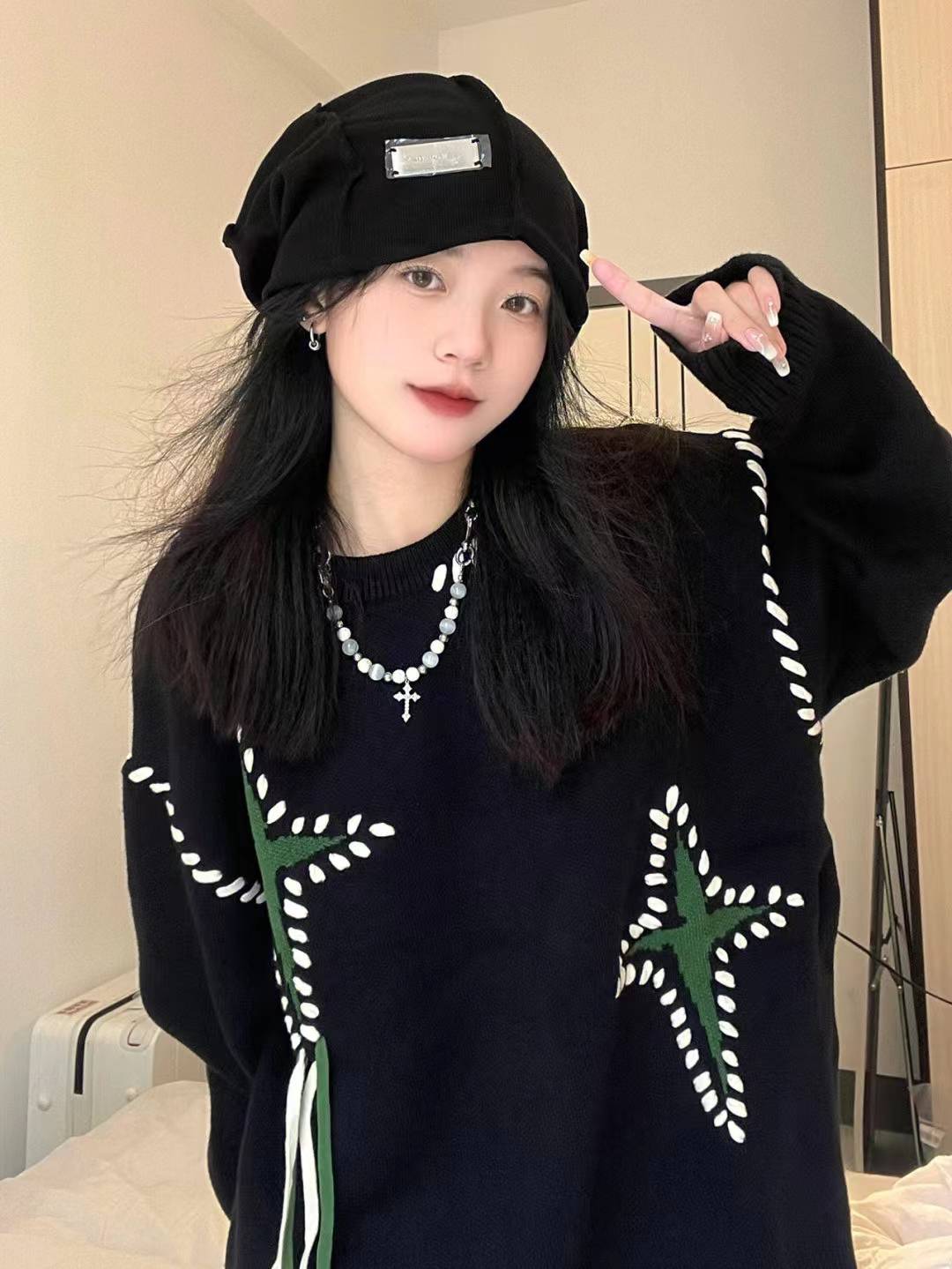 奶fufu温柔慵懒风黑色V领毛衣外套女秋冬显瘦中长款上衣