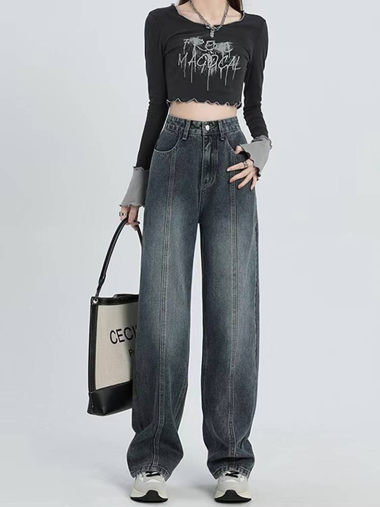 栗馨馨复古牛仔裤女高腰显瘦2022新款冬季加绒高街潮垂感宽松阔腿