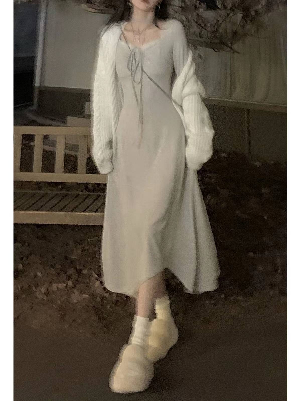 栗馨馨法式桔梗连衣裙女2022秋季新款不规则内搭针织长裙