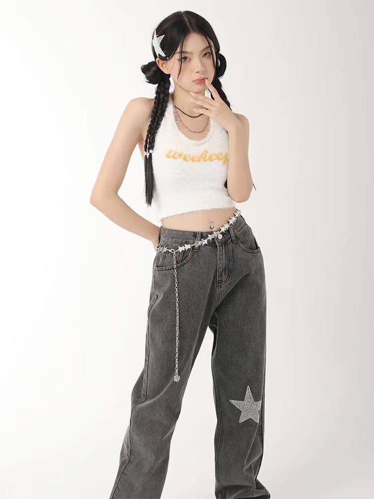 栗馨馨复古高腰灰色阔腿裤女早秋新款烫钻五角星宽松显瘦潮