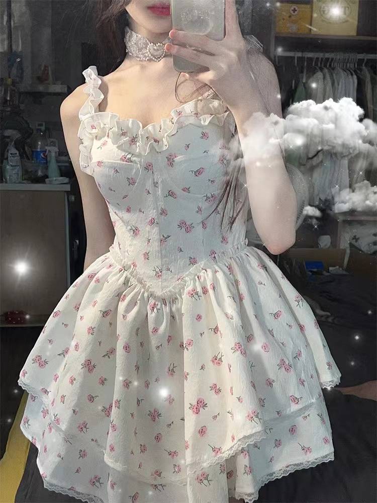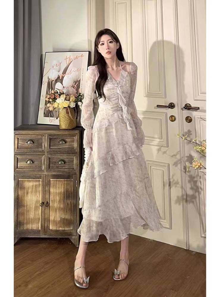 2018夏季新款韩版甜美气质V领碎花中长款高腰百褶连衣裙